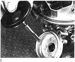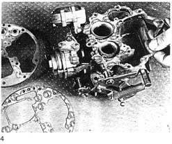 Inspection 1. Locate the two vacuum supply holes for the second stage diaphragm housing. (See Fig. 1 ) 2. While the plate block section is removed, lift the second stage diaphragm and place fingers over the vacuum holes in the venturi. (See Fig. 2.) 3. Release the diaphragm. Vacuum will hold the diaphragm if there are no leaks. 4. If the diaphragm is bad, only it needs replacing. (See Fig. 3) 5. Reassemble carburetor using all new gaskets. (See Fig. 4) |