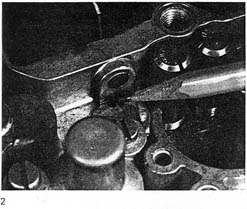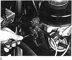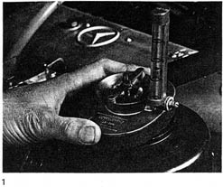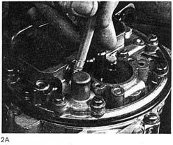 Adjustment 1. With car at full operating temperature, synchronize the throttle plates of each carburetor using "Syncro-Test" device and adapter piece. Adjust to specified idle RPM. (See Fig. 1) 2. Adjust idle mixture screws to the same position by blocking off the idle air bore in the top cover, one at a time, and matching the RPM drop. This procedure prevents damaging the idle mixture screws. (See Fig. 2 and 2A) 3. Observing tachometer and exhaust analyzer, adjust throttle valves, and mixture as necessary to arrive at specified idle RPM and specified carbon monoxide. (See Fig. 3) NOTE: Continually check balance of throttle valves (using "Synchro-Test") and mixture (using idle air bores) as the adjustments are made. |