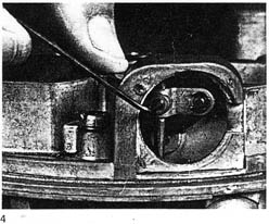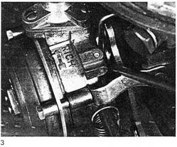 Adjustment 1. Block throttle linkage partially open to free choke cam. (See Fig. 1) 2. Loosen set screw at top of choke rod. (See Fig. 2) 3. Lift relay lever at bottom of choke rod to its full up position. (See Fig. 3) 4. Close choke flap fully, allowing connecting lever to center itself, and tighten set screw.(See Fig. 4) Note: Late types have 1.5 mm. allen set screw. |