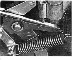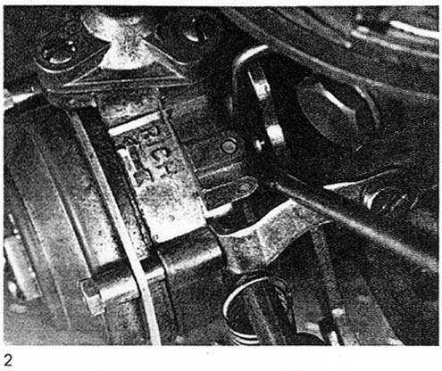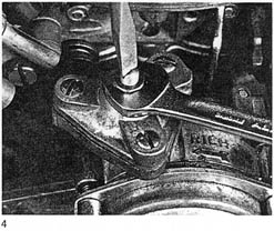 Adjustment 1. Set carburetor at fast idle by actuating choke step cam. To do this, crack open throttle (See Fig. 1) 2. Close the choke flap by lifting choke relay lever. (See Fig. 2) 3. Release throttle. 4. Start engine without touching throttle. 5. Lift relay lever at bottom of choke rod to its full up position. (See Fig. 2) 6. Using a rod of proper diameter, measure the gap present between the lower flap of the choke and the carburetor housing. (See Fig. 3) 7. Adjust at the adjusting screw on diaphragm housing. (See Fig. 4) |